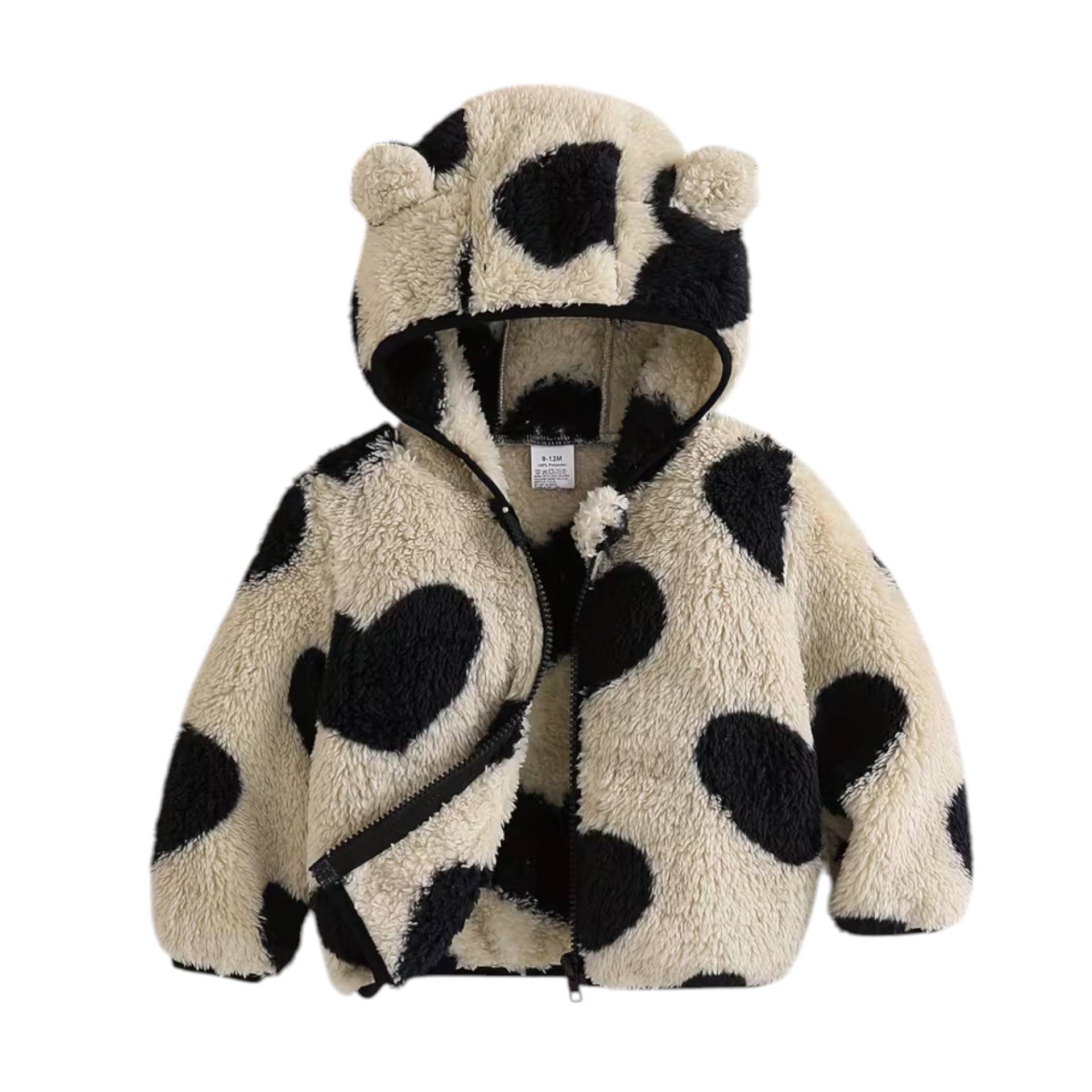 Dit fleece jasje met hartjes patroon en rits aan de voorzijde is leuk te combineren met één van onze handgemaakte broekjes. Het jasje is maat 74/80, gemaakt van 100% Polyester.
