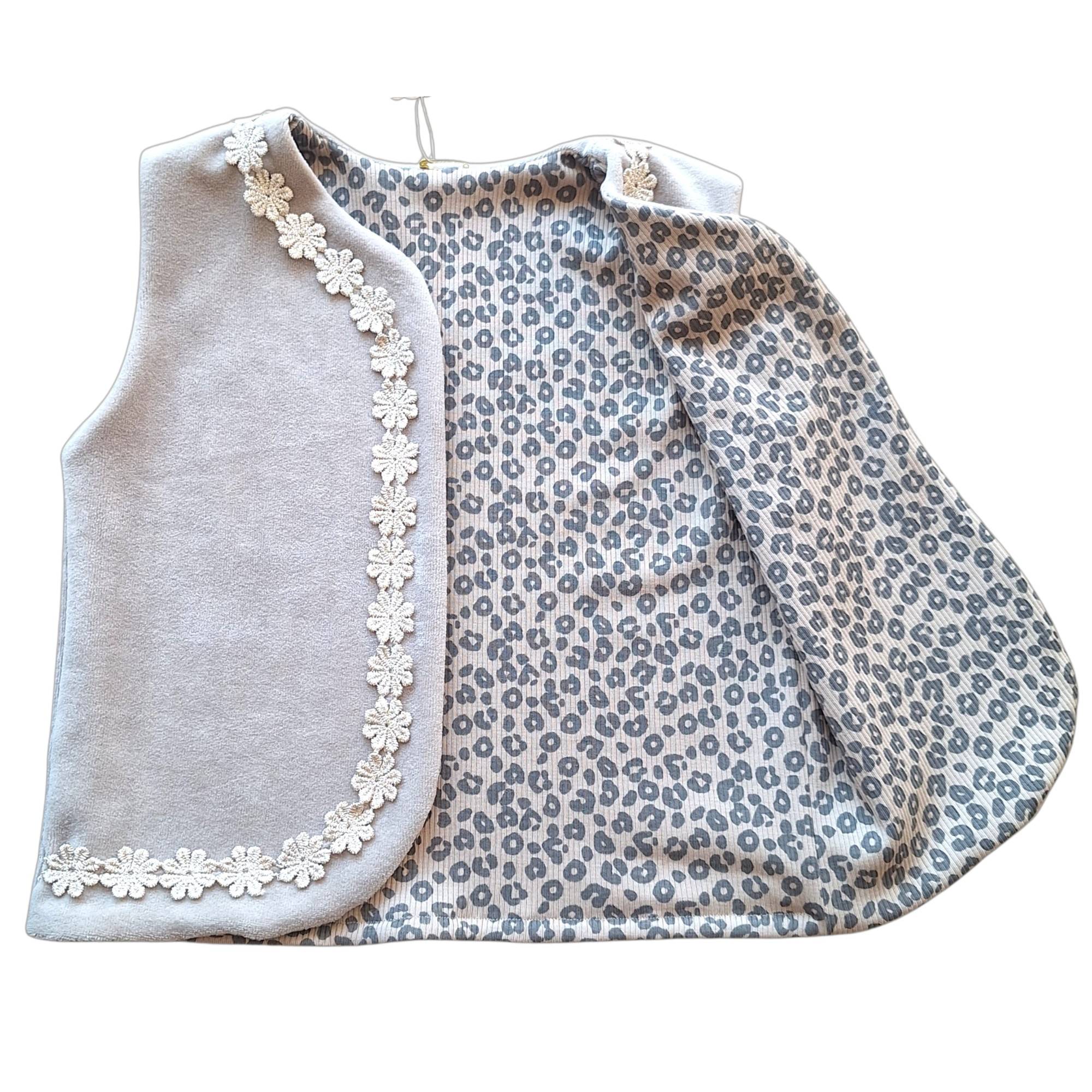 Dit giletje is gemaakt van een heerlijk zachte beige velours stof. Het giletje is gevoerd met een zachte rib tricotstof met panterprint. Het giletje is aan beide kanten te dragen.
