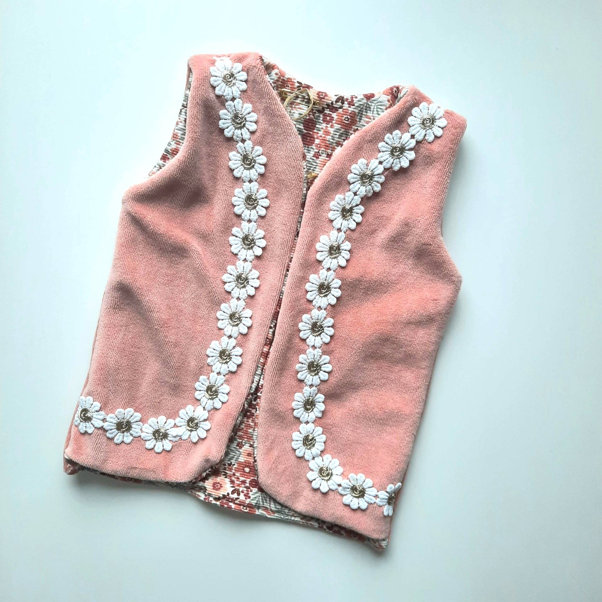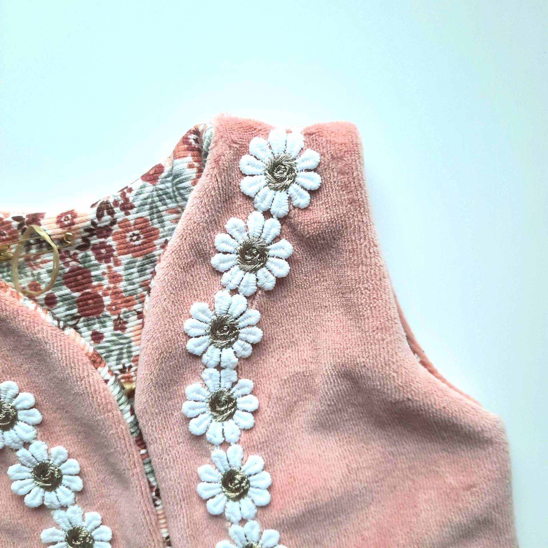 Dit giletje is gemaakt van een heerlijk zachte velours stof. Het giletje is gevoerd met een leuke ribstof met bloemenprint. Het giletje is aan beide kanten te dragen.