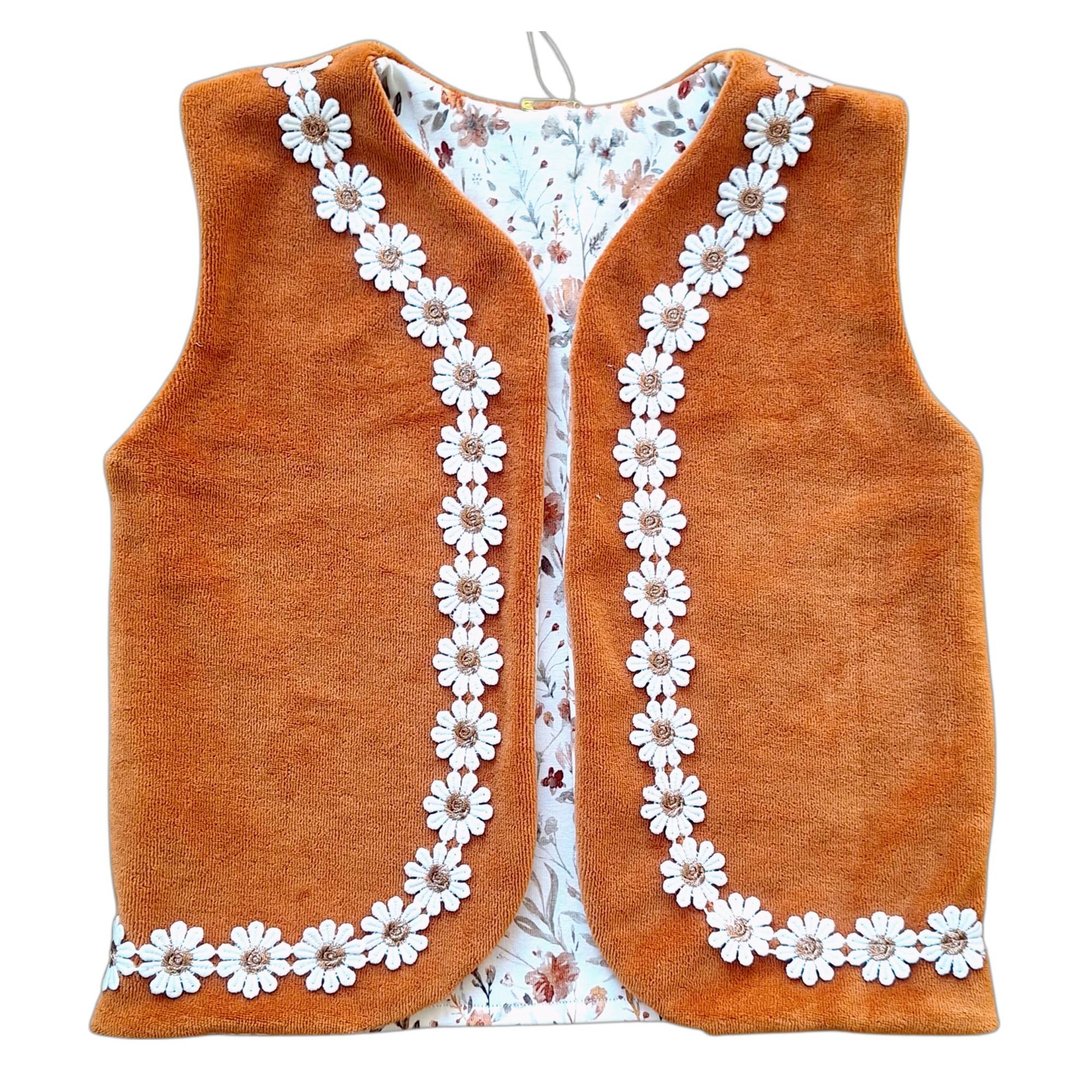 Dit giletje is gemaakt van een heerlijk zachte terracotta velours stof. Het giletje is gevoerd met een zachte tricotstof met herfstbloemenprint. Het giletje is aan beide kanten te dragen.
