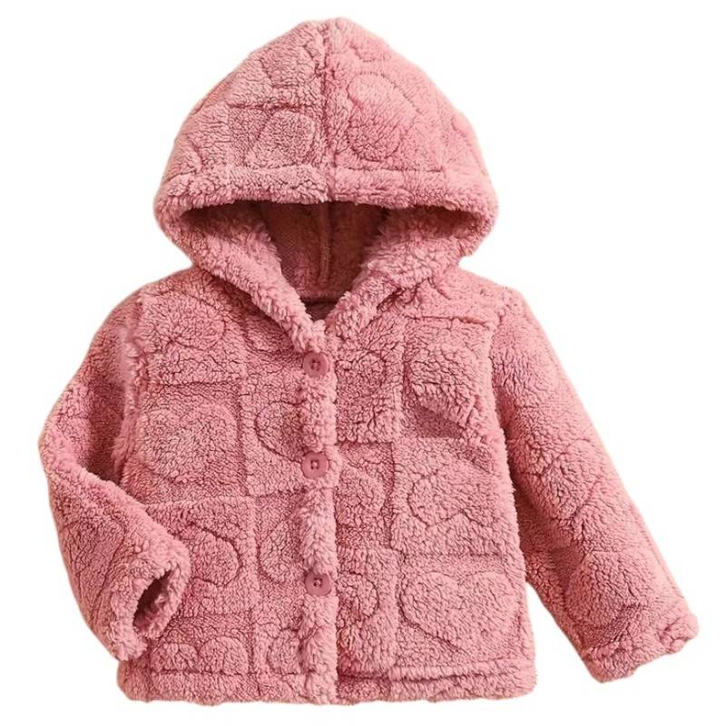 Dit roze teddy jasje met hartpatroon en knopen aan de voorzijde is leuk te combineren met één van onze handgemaakte broekjes. Het jasje is maat 74/80, gemaakt van 100% Polyester.