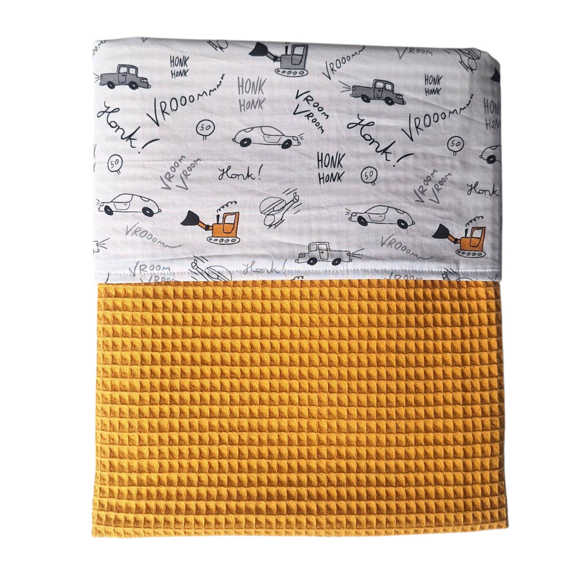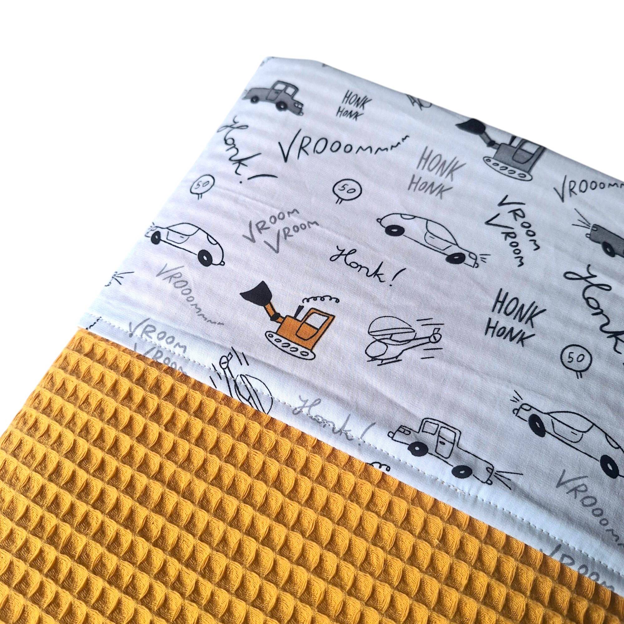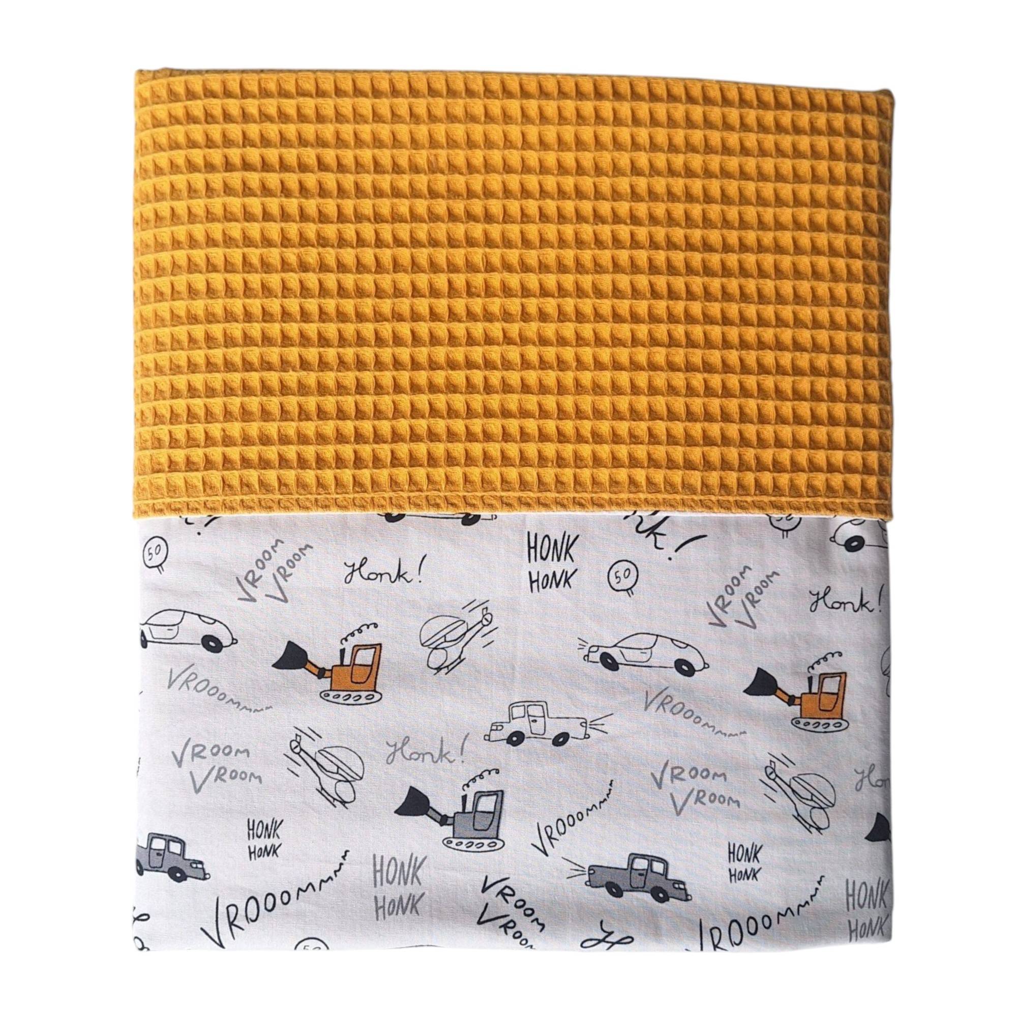 Deze leuke wiegdeken is gemaakt van een oker kleurige wafelstof in combinatie met een katoenstof met voertuigen print.