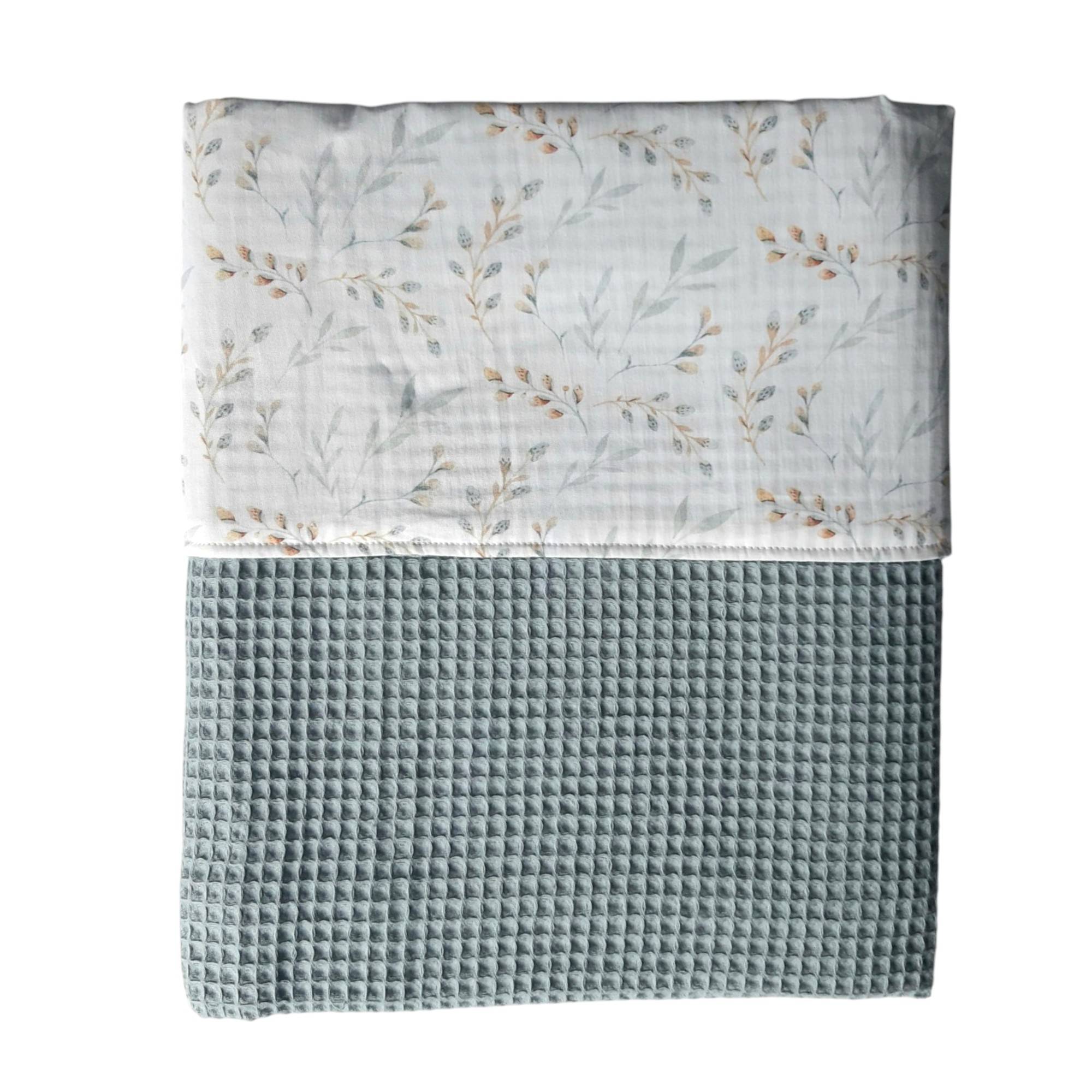 Deze leuke wiegdeken is gemaakt van een licht oudroze wafelstof in combinatie met een katoenstof met wilgentakjes print.