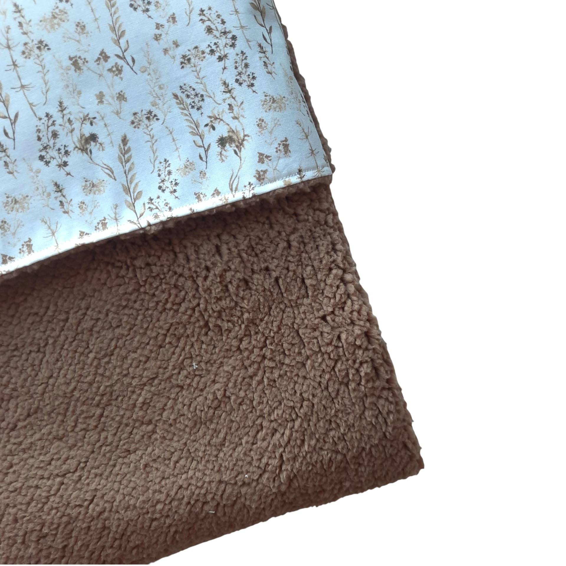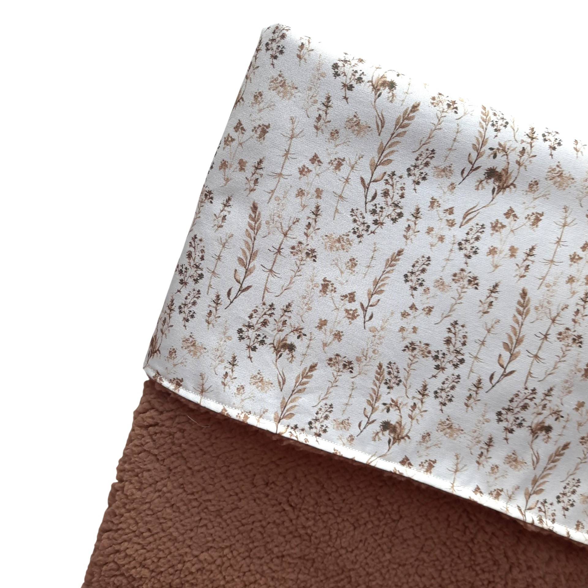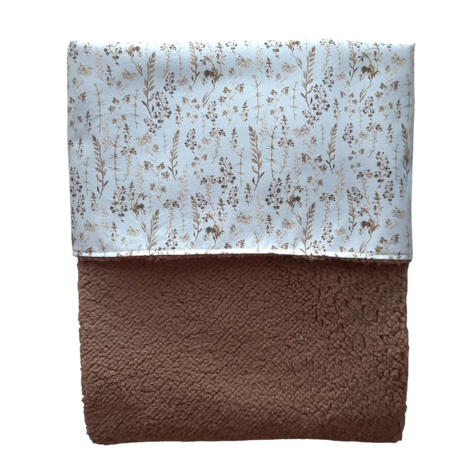 Deze leuke wiegdeken is gemaakt van een zachte teddystof bruin in combinatie met een katoenstof met droogbloemen print.