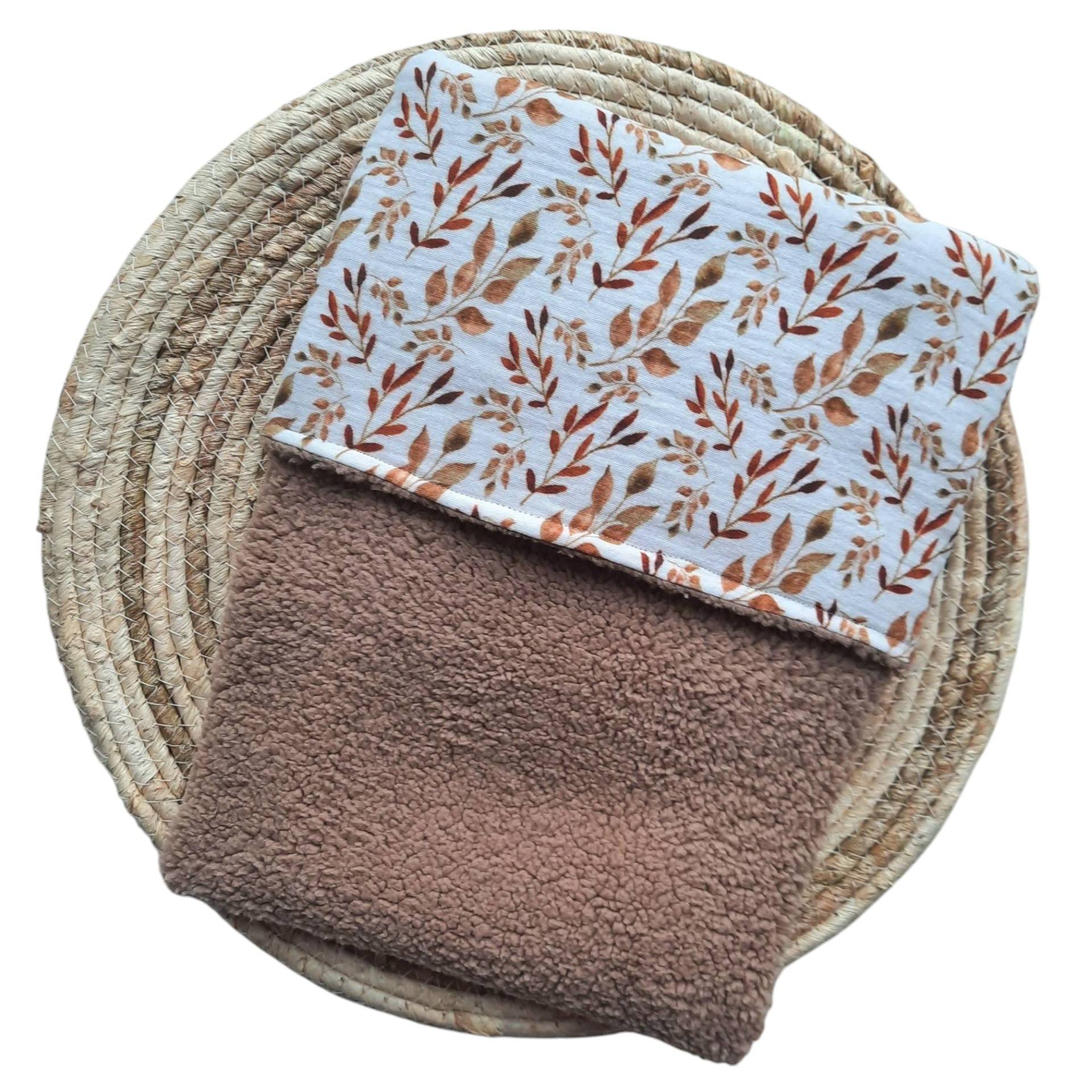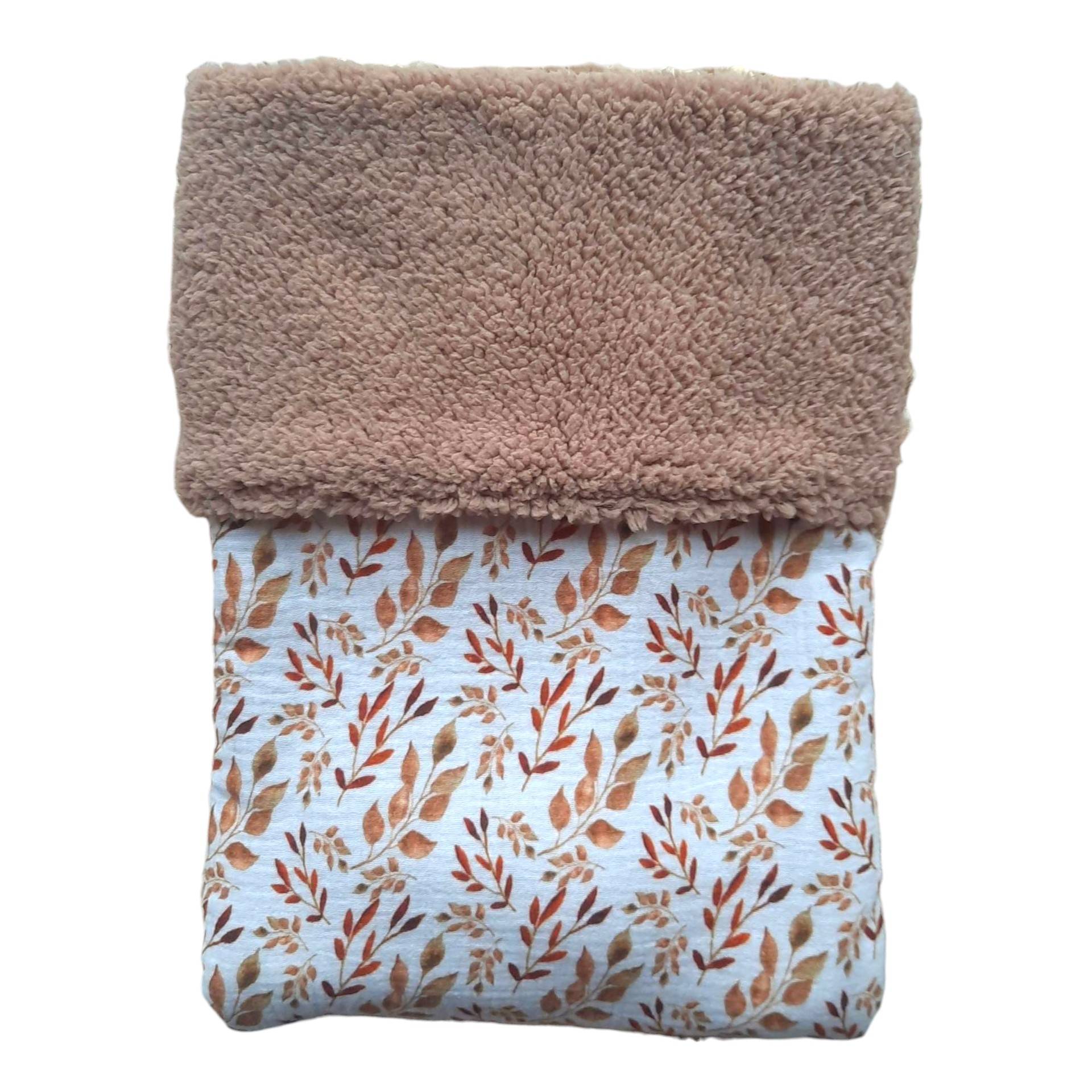 Deze leuke wiegdeken is gemaakt van een zachte teddystof donker beige in combinatie met een hydrofielstof met blaadjes print.
