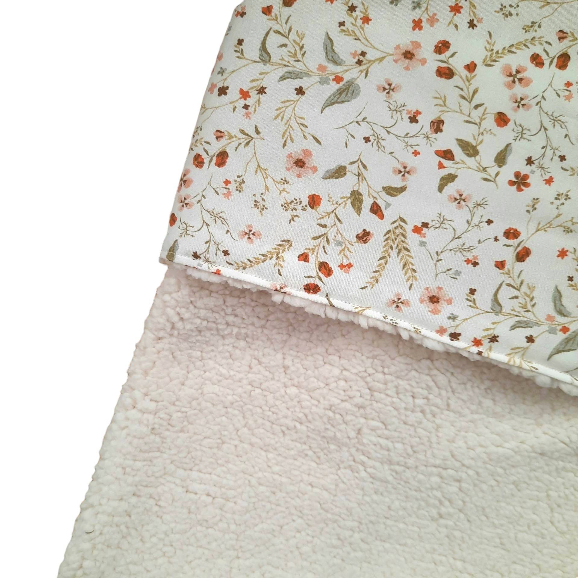 Deze leuke wiegdeken is gemaakt van een zachte teddystof naturel in combinatie met een katoenstof met 1000 bloemetjes print.
