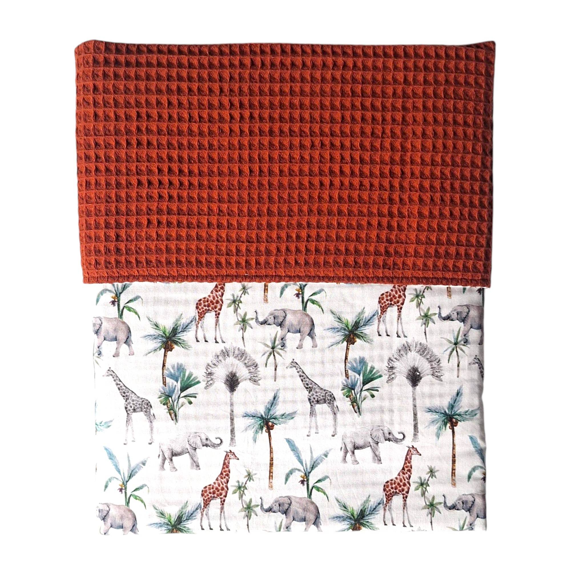 Deze leuke wiegdeken is gemaakt van een terracotta kleurige wafelstof in combinatie met een katoenstof met jungle print.