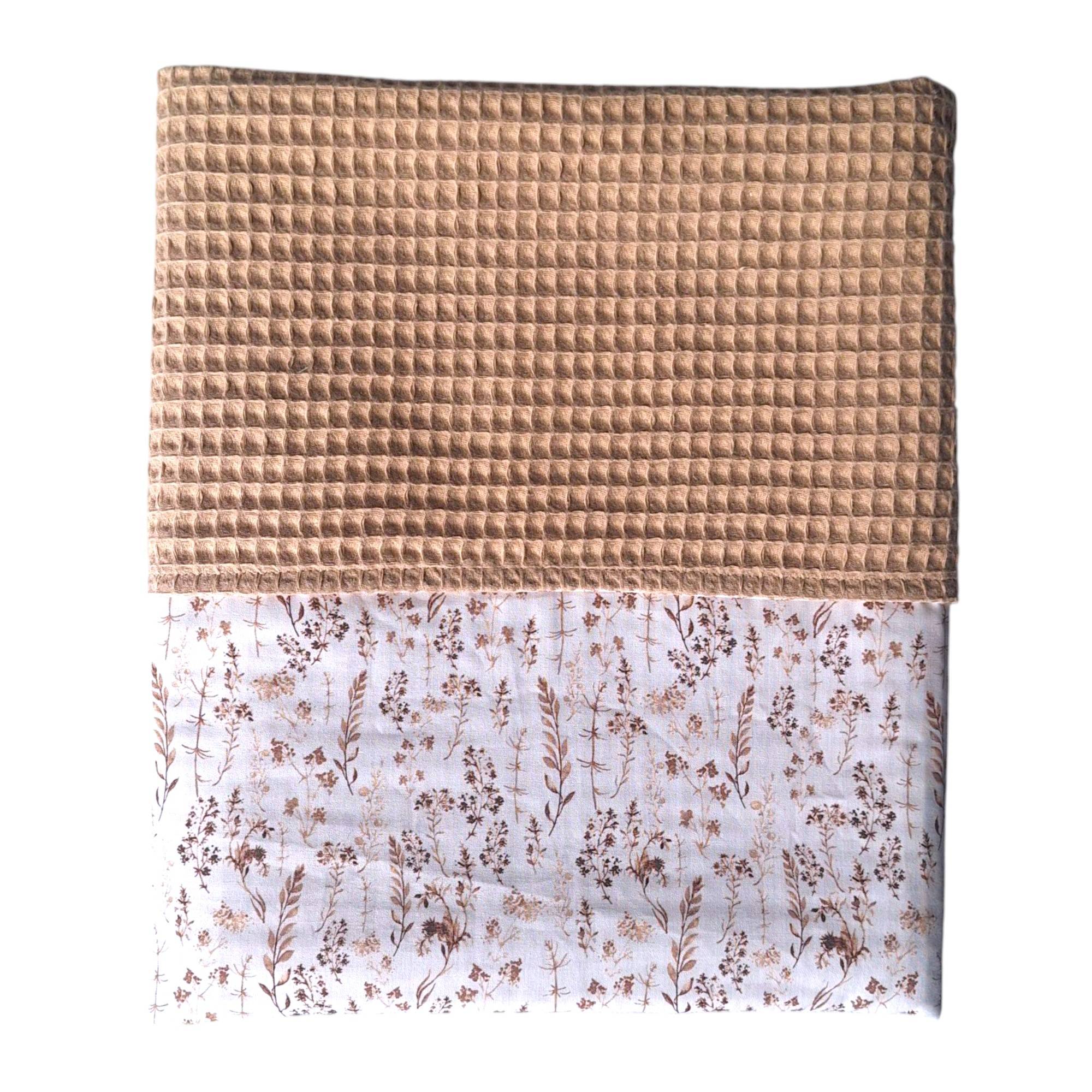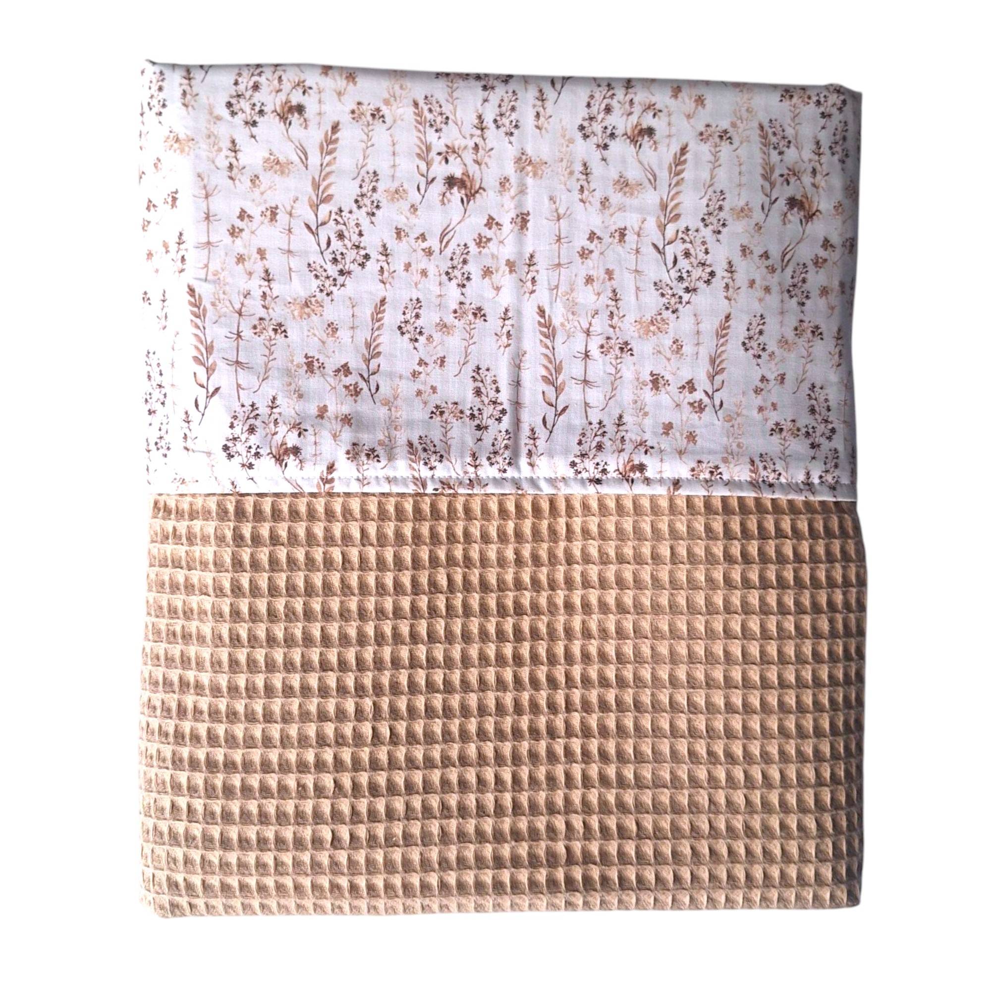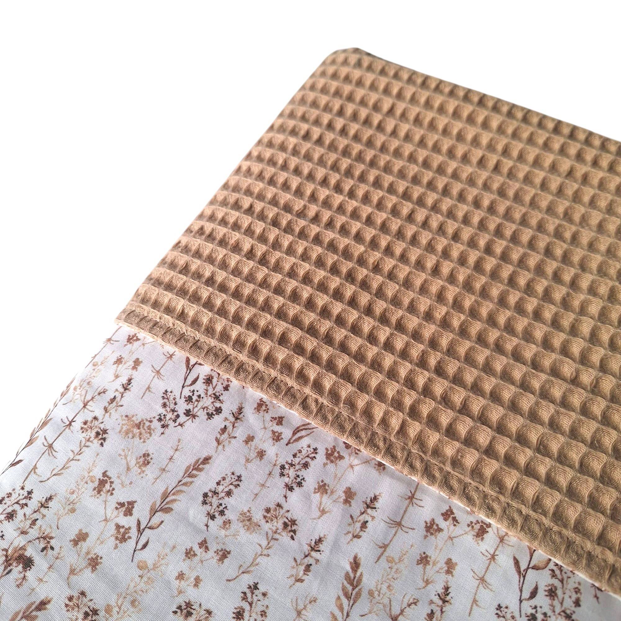 Deze leuke wiegdeken is gemaakt van een zand kleurige wafelstof in combinatie met een katoenstof met droogbloemen print.