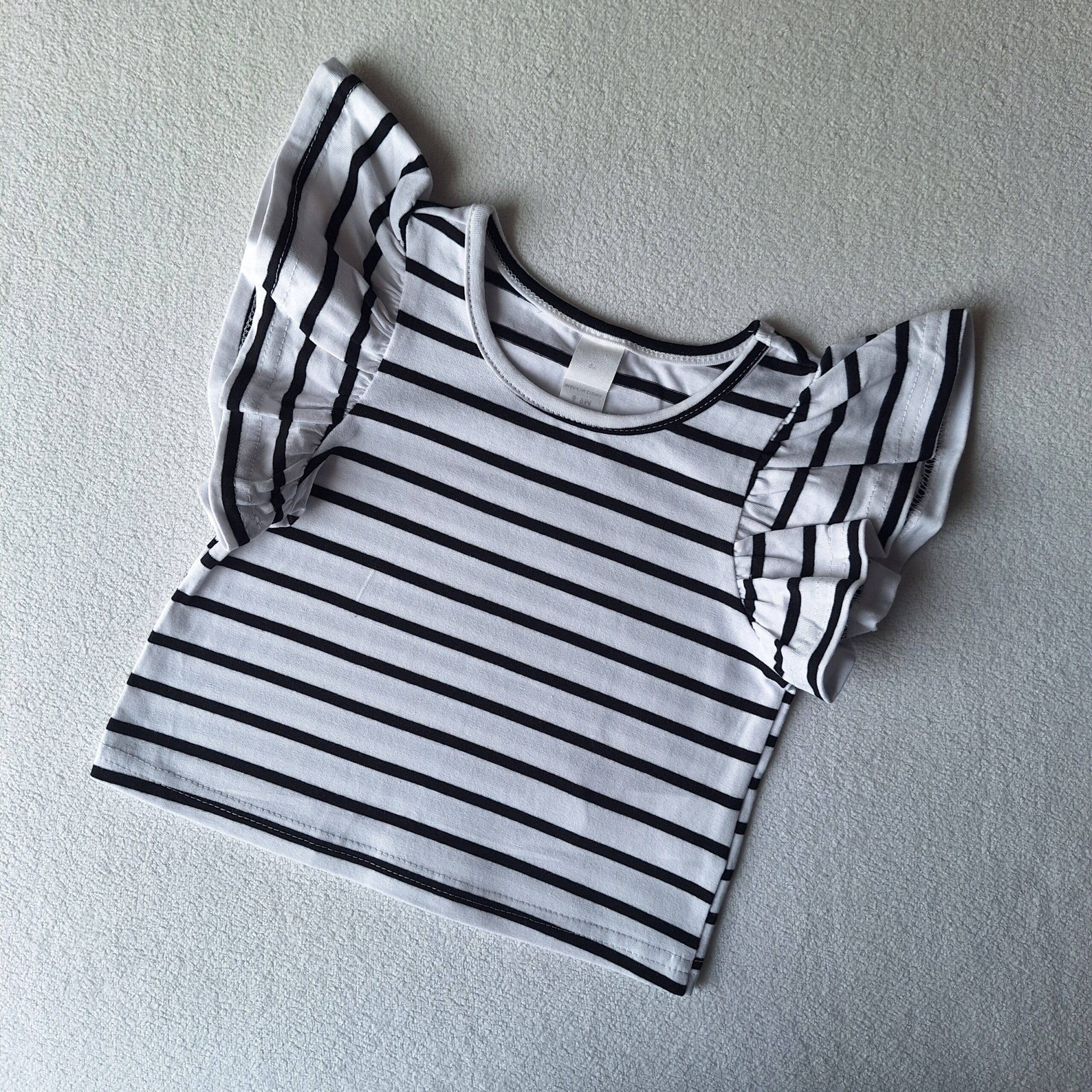 Dit zwart-wit gestreepte shirt is leuk te combineren met één van onze handgemaakte broekjes of rokjes. Het shirtje is maat 62/68, gemaakt van 62% Polyester, 34% Katoen, 4% Elastane.